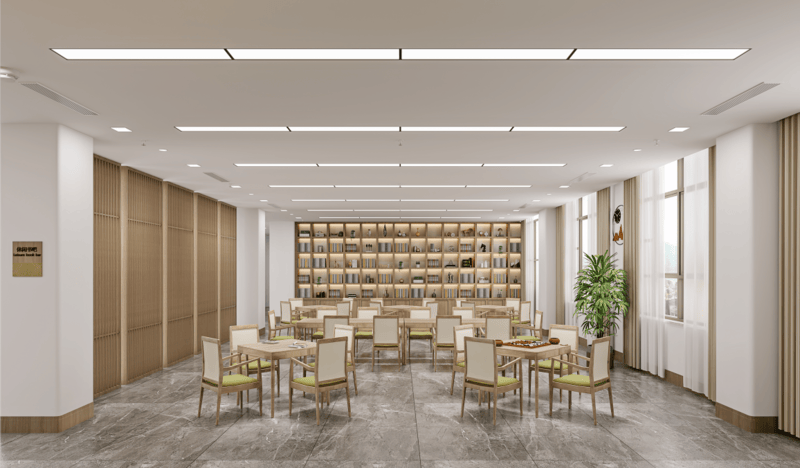 内公共活动空间丰富多样,宛如一座文化娱乐的宝库。健身房里,长者可以挥洒汗水,保持健康体魄;乒乓球室、台球室中,切磋球技,增进友谊;书法室、绘画室里,挥毫泼墨,抒发情感;社团活动室、党员活动室是交流思想、开展活动的理想场所;理发室让长者时刻保持整洁形象;冥想室为心灵提供宁静的港湾;手工室激发创造力,享受手工乐趣;麻将室、舞蹈室充满欢声笑语;多功能厅可举办各类大型活动;图书馆里书香四溢,满足阅读需求;厨艺学堂传授烹饪技巧,享受美食乐趣;玉兰剧场、大师工作室、玉兰书苑更是为长者提供了展示自我、学习交流的平台。医疗保障,守护健康无忧
