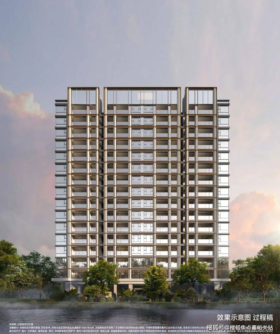 材质:局部温润石材、仿铜铝板、仿石铝板及局部仿石涂料,竖向铝板提升品质感