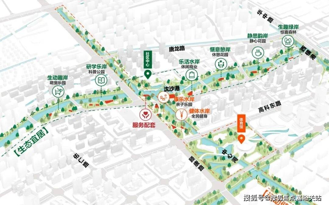 项目近距离内被唐镇公园、唐丰公园、华夏公园、张江科学城中央公园、4大公园环绕,这些都是城市稀缺的大型城市绿肺,天然氧吧,在为居民提供休闲,亲近自然的好去处的同时提供高浓度的负氧离子,净化空气。未来金城片区还将依托沈沙港、中心河打造特色蓝绿空间“十字绿轴”,构建连续滨水慢行网络和社区中心,集中营造多主题、多层次的主题岸线,形成丰富多样、有活力的水岸空间。